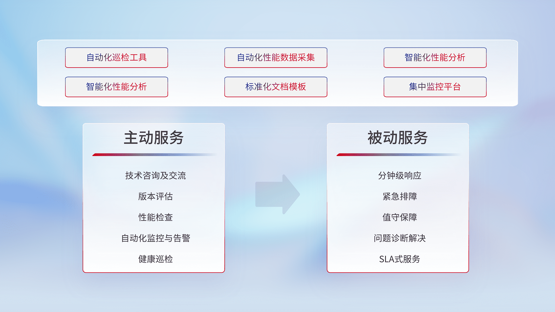智能化工具和标准化文档,,保障服务质量,,提供主动服务(包含技术咨询、、、、版本评估、、、性能检查、、、、自动化监控与告警、、、、健康巡检)和被动服务包含(分钟级响应、、紧急排障、、值守保障、、、、问题诊断解决、、SLA服务)。。。